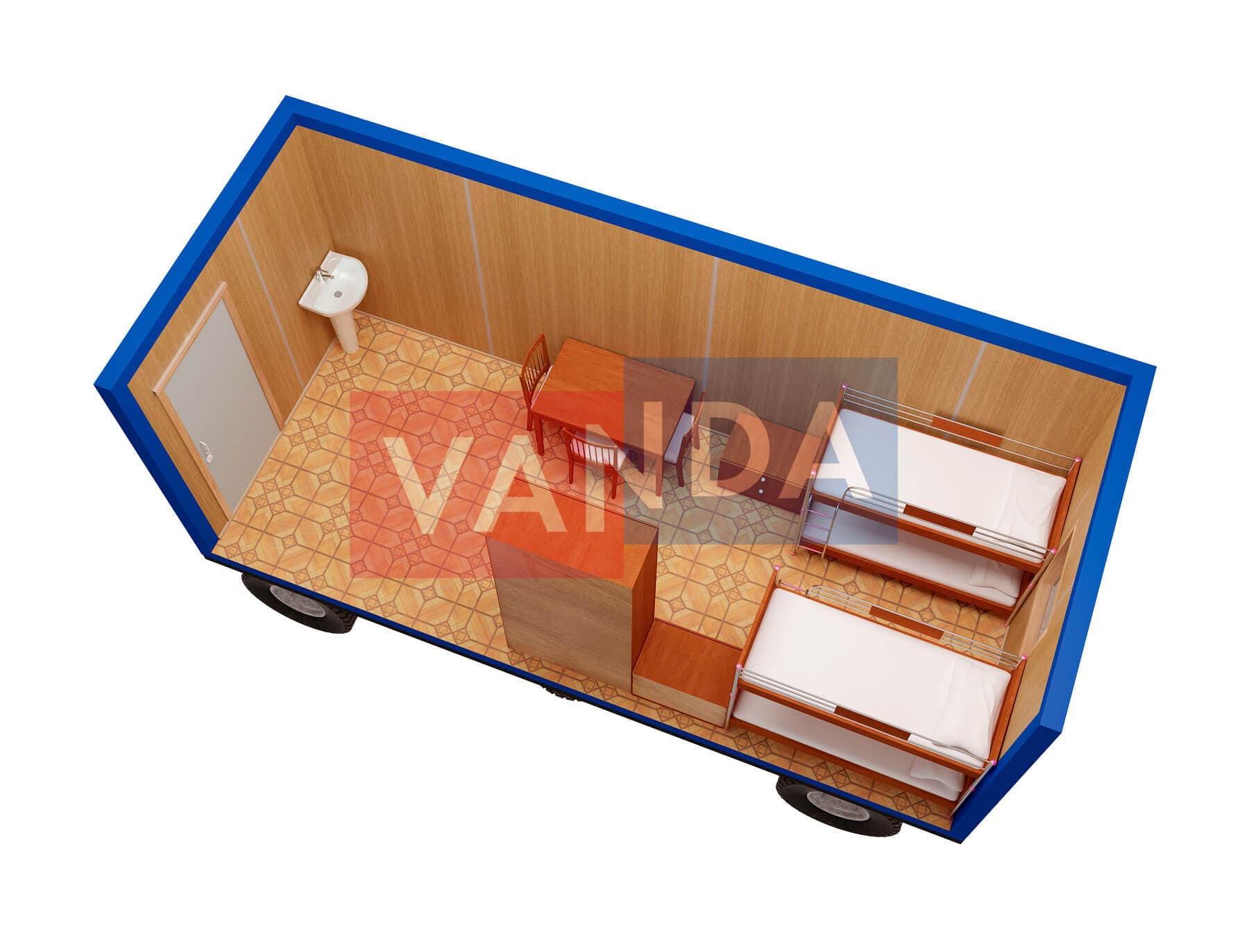 Блок-контейнер на шасси 5,85х2,4 изготавливается из несущего каркаса (верхняя и нижняя обвязка): швеллер 100х50х3 мм., угловые стойки: сложно - гнутый угол 90х90х3 мм., крыша блок-контейнера: металл сварной 0,9-1 мм., качественная наружная отделка: оцинкованный профлист, внутренняя отделка стен: ЛДСП, внутренняя отделка потолка: Панели ПВХ, вспомогательный деревянный каркас (стены): брусок 40х75 мм., лаги пола: обрезная доска 40х100 мм., лаги потолка: обрезная доска 40х100 мм., выполнено утепление: Минеральная вата «ISOVER» – 50 мм. и пароизоляция: плёнка техническая, черновой пол состоит из: обрезная доска 20 мм. (2 сорт), чистовой пол покрыт: ДСП строительное 16 мм., отделка пола выполнена из качественных материалов. Контейнер комплектуется окнами: деревянное, двойное остекление 800х1000, входной дверью: ДГ 21-8 обшита снаружи оцинкованным листом, врезной замок и внутренними дверями: ДГ 21-8 (при наличии перегородки). Если в БК присутствуют перегородки, то для них используется: брусок 40х50 мм.